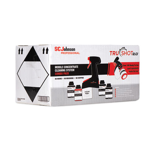 Package Includes: (4) TruShot 2.0™ Cartridges and (1)TruShot 2.0™ Trigger Sprayer: Glass and Multi-Surface Cleaner; Multi-Surface, Restroom Cleaner and Disinfectant; Power Cleaner and Degreaser; Restroom Cleaner; Trigger Dispenser