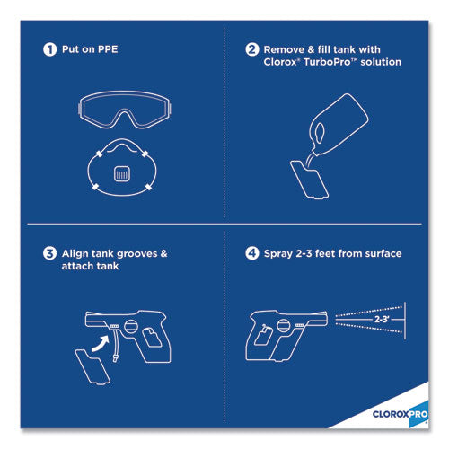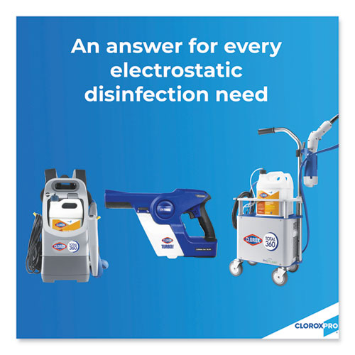 Get your entire space Clorox® clean in minutes. The Clorox® TurboPro™ Electrostatic Sprayer is engineered to disinfect high-touch areas within places such as schools, offices, athletic facilities and healthcare settings more quickly and efficiently with the convenience of touchless coverage. Clorox® electrostatic sprayers are explicitly paired with EPA-registered chemistries that are designed especially for sprayer devices. When used with the Clorox® TurboPro™ Disinfectant Cleaner (sold separately), this cordless sprayer disinfects hard-to-reach places in airports, daycare centers, hotels, laundry rooms and long-term care facilities. This cleaning device comes with a rechargeable battery that offers up to four hours of continuous spraying on a single charge. It also features a 33.8 oz removable tank that's easy to refill so you can get back to spraying more quickly. Approved and tested for use with Clorox® TurboPro™ Disinfectant Cleaner (not included). Sprayer/Hose/Nozzle Type: Sprayer; Sprayer/Nozzle Type: Trigger; Nozzle/Sprayer Settings: Fan Mist; Capacity (Volume): 32 oz.