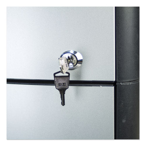 Brushed metal sides and front make this perfect for any office. Built-in rails for hanging letter size files. Label holders on front of drawers make it easy to identify contents. Easy sliding system for smooth drawer operation. Locking drawers keep contents safe and secure. Dual-purpose: can be used under worksurface or as a freestanding unit. Moves with ease from one area to another and lock in place when it has reached it's final destination. Organizing Tray On Top. Color: Silver/Black; Color Family: Gray; Overall Width: 19"; Overall Depth: 15".