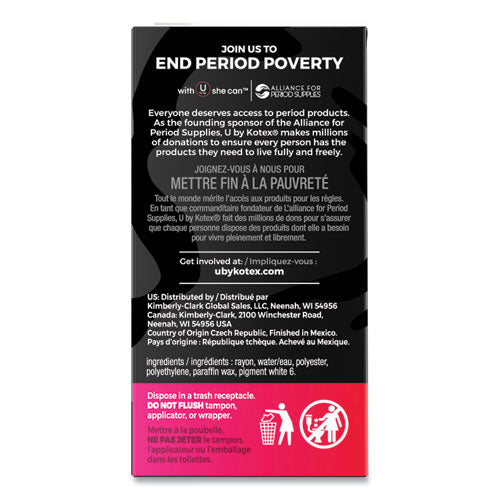 Get full-sized period protection with a comfortable compact tampon! U by Kotex® Click® Tampons allow you to discreetly carry in your purse or pocket. Small in size but big on protection, these tampons go from compact to a full-size tampon in one easy step. Pull the lower half of the tampon until you hear it lock and then insert. Click® Tampons are designed with a smooth tip for comfortable, quick and easy insertion. The tampon expands so you're fully covered to help stop leaks. These unscented tampons are not made with natural rubber latex and have no fragrance added.