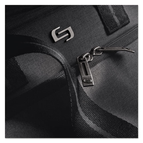 Fully padded 15.6" laptop compartment. Interior iPad®/tablet pocket. Full size front zip-down organizer section. Padded carry handles with magnetic snaps. Adjustable shoulder strap. Back strap slides over luggage handle. For Use With: Laptops; Color(s): Gray; Color Family: Gray; Material(s): Polyester.