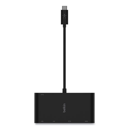 Keep watching and stay charged with a multimedia adapter that enables up to 100W of pass-through power. The five-port adapter supports Gigabit Ethernet, USB-A 3.0, VGA, 4K HDMI, and data transfer through USB-C®, making it the perfect tool in meetings, auditoriums, classrooms, or on the go. This simple plug-and-play technology is compatible with Mac and Windows laptops and USB-C devices. Cable Type: USB-C to 4K HDMI/USB-A/VGA; Connector/Port/Interface: 4K HDMI; USB-A; USB-C; VGA; For Device Type: Desktop; Laptop; Connects Devices (From/To): USB-C to USB-A/VGA/4K HDMI.