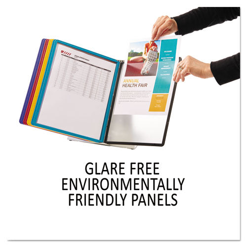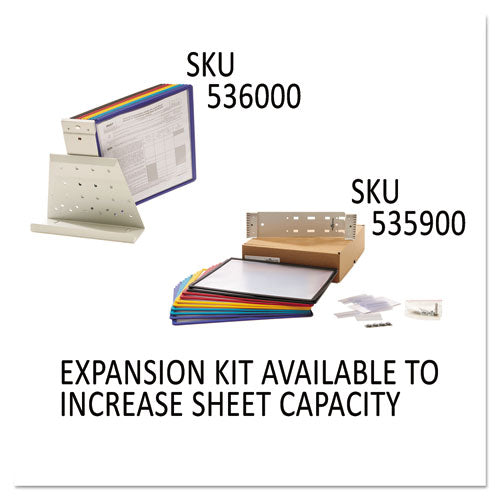 Metal desk system designed especially for facilities. Glare-free, polypropylene sleeves with rugged frames for heavy use. Letter-size inserts easily slide into sleeves. Two viewing angles to choose from - 30 degrees or 60 degrees. Includes metal desk stand, metal sleeve bracket, sleeves and snap-on tabs. Expandable up to 60 views by adding item Durable 535900, sold separately. Assorted Panels—Two each: black, blue, green, red and yellow; includes snap-on tabs. Material(s): Metal; Sheet Capacity: 20; Number of Compartments: 10; Compartment Size: Letter.