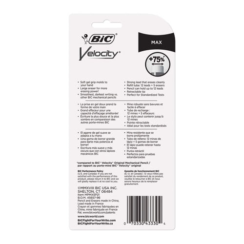 Wider eraser compared to BIC® Velocity® Original Mechanical Pencil. Soft gel grip molds to your hand. Smoother and darker writing versus other BIC® mechanical pencils. Retractable (Yes/No): Yes; Eraser (Yes/No): Yes; Graphite Color(s): Black; Color Family: Black.