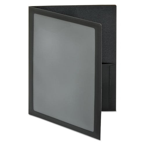 Provides a custom look with framed insertable front cover. The wing-style pockets are definitely a cut above the straight horizontal. Keeps business card at hand in die-cut holder on inside back pocket. Holds 100 sheets. Front Cover Color(s): Clear; Color Family: Clear; Back Cover Color(s): Black; Sheet Size: 11 x 8.5.