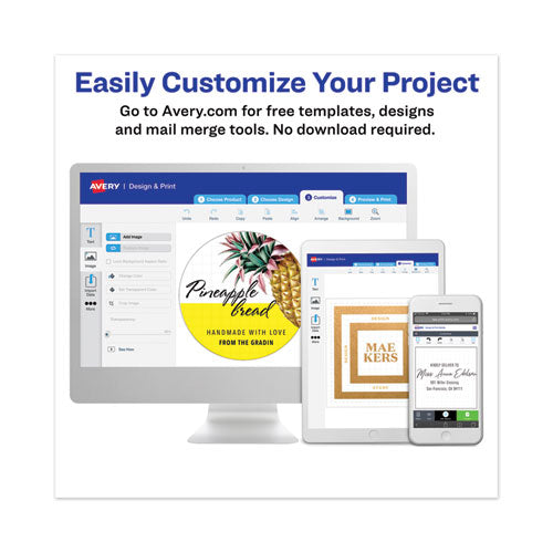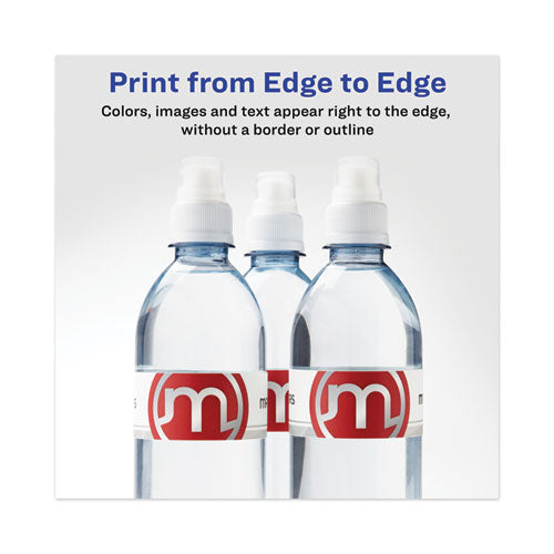 Showcase your brand with these versatile wraparound labels. Their water-resistant material and permanent adhesive make them perfect for branding water bottles. They're also ideal for use on products, packaging, marketing materials and more to make your brand or logo really stand out in the crowd. They stick to glass, plastic, paper and other materials, so you can put your mark on nearly any product. Our Print-to-the-Edge feature lets you add a full-color background and with free templates from Avery® Design & Print, you can easily customize the labels with your branding in mind. Brand your business with these unique labels. Print-to-the-Edge of the label for a custom look. Shape: Rectangular; Label Size - text: 9.75 x 1.25; Label Color(s): White; Color Family: White.