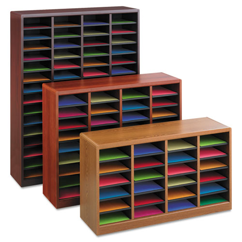 A great addition to mailroom, office, school or store. Stores and organize literatures up to 8 1/2 x 11 in large 3" high compartments to hold up to 750 sheets of paper. Attractive, durable laminate with radius corners. Constructed of 3/4" furniture-grade compressed wood. Customize your storage with the removable hardboard shelves that allow you to expand compartment size. Solid fiberboard back. Black plastic label holders (labels included). Easy assembly with cam-lock fasteners. Literature Sorter Type: Open Front; Number of Compartments: 24; Compartment Size: Letter; Material(s): Fiberboard/Hardboard.