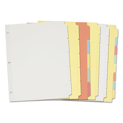 Stay on top of your documents and keep your important paperwork separated with ease using these Plain Tab Write-On Dividers. Identify each section in a flash thanks to nonlaminated tabs you can write on directly. A clear reinforced strip along the binding edge strengthens the three punched holes to resist tearing on your binder's rings. Your documents will be organized and you'll be in charge. Bulk packed for better value. Buff Dividers. Index Divider Style: Customizable; Index Divider Size: 11 x 8.5; Punched/Unpunched: 3-Hole Punched; For Use With: Ring Binders.