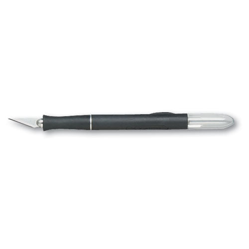 Easy-grip barrel for comfort and precision with center barrel blade release. No-roll design. Replacement blades sold separately. Knife Type: Replaceable Blade Knife; Blade Type: Replaceable; Number of Blades: 1; Handle Material: Rubber Grip.