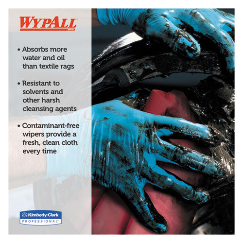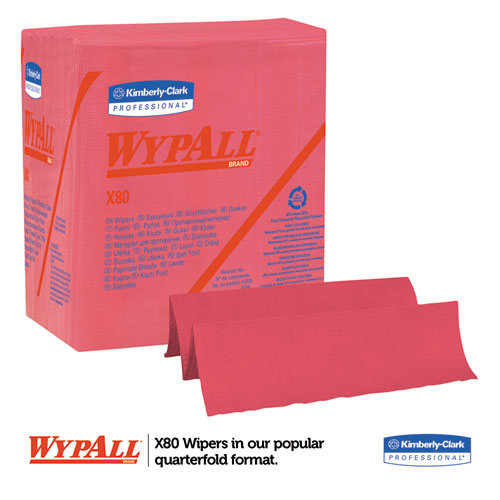 Trust the WypAll* Brand, the one that sets the standard for excellence in wipers. WypAll* X80 Cloths feature innovations like high-tech HydroKnit fast-absorbing material and are durable for scrubbing. These contaminant-free commercial cloths are a favorite replacement for laundered shop towels, which can harbor dangerous chemicals, such as lead. WypAll* X80 Cloths are made of soft pulp fibers, bonded to a polypropylene base sheet for absorbency and durability, making them suitable for removing dirt, oil, grime and solvents in industrial and manufacturing businesses. The reusable cloths are reinforced for strength when wet and dry. These bulk cloths are a great alternative – safer and more efficient – to replace laundered rental shop towels or cleaning rags. Use them for heavy duty machine- and part-wiping, wiping metal shavings, prepping surfaces with solvents and cleaning rough surfaces. After all, every business gets dirty. But for the toughest grease and grime, you can trust WypAll* X80 Cloths. Quarterfold. Towel/Wipe Type: Quarterfold; Application: General Purpose; Material(s): HYDROKNIT*; Color(s): Red.