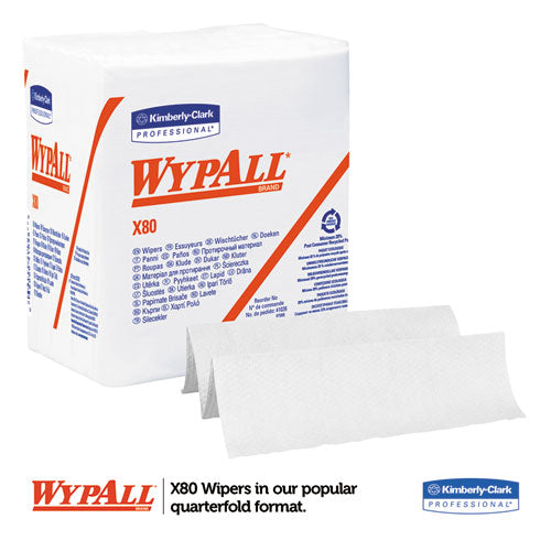 Trust the WypAll* Brand, the one that sets the standard for excellence in wipers. WypAll* X80 Cloths feature innovations like high-tech HydroKnit fast-absorbing material and are durable for scrubbing. These contaminant-free commercial cloths are a favorite replacement for laundered shop towels, which can harbor dangerous chemicals, such as lead. WypAll* X80 Cloths are made of soft pulp fibers, bonded to a polypropylene base sheet for absorbency and durability, making them suitable for removing dirt, oil, grime and solvents in industrial and manufacturing businesses. The reusable cloths are reinforced for strength when wet and dry. These bulk cloths are a great alternative – safer and more efficient – to replace laundered rental shop towels or cleaning rags. Use them for heavy duty machine- and part-wiping, wiping metal shavings, prepping surfaces with solvents and cleaning rough surfaces. After all, every business gets dirty. But for the toughest grease and grime, you can trust WypAll* X80 Cloths. Quarterfold. Towel/Wipe Type: Dry Wipes; Application: General Purpose; Material(s): HYDROKNIT*; Color(s): White.