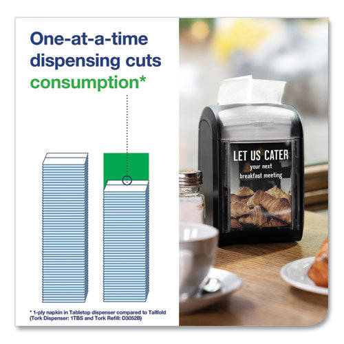 Run your business more efficiently. Tork Xpressnap Napkin Dispensers are the ideal napkin solution for counters or tables at small chains or independent restaurants. Our most compact Xpressnap system ever has one-at-a-time napkin dispensing and focuses on several critical factors. Serves more guests between refills compared to tallfold and minifold systems. Reduces material costs through less consumption and waste of napkins. Makes optimum use of limited space on counters and tables. Cuts inventory space. Maintains high hygiene standards. The practical refill level indicator signals to employees when to easily refill the dispenser enabling 100% napkin availability. The "AD-a-Glance" dispenser display offers a unique placement option for advertising, individual, effective and free.